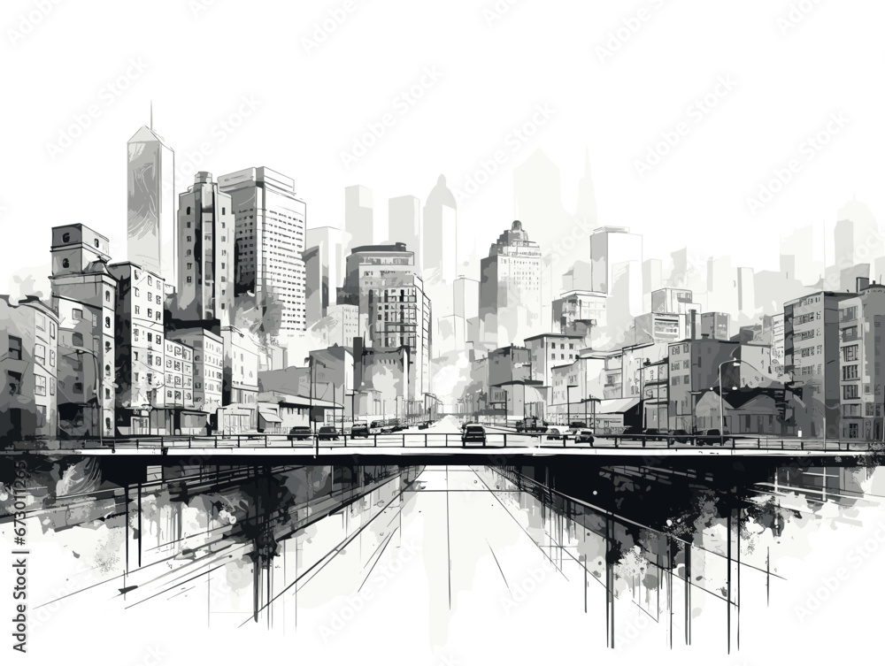 Drawing of City graphic black white cityscape illustration separated, sweeping overdrawn lines. #673011265