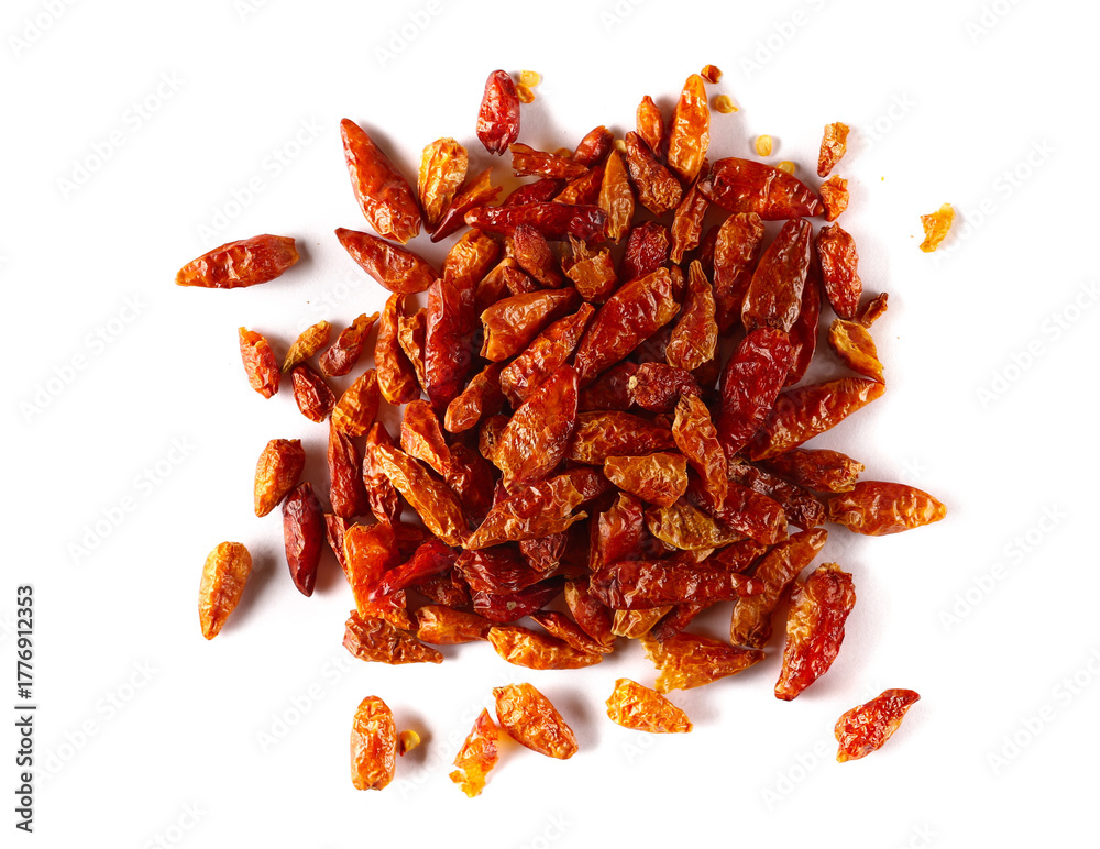 Dried bird's eye chili peppers pile isolated on white background, top view #1776912353