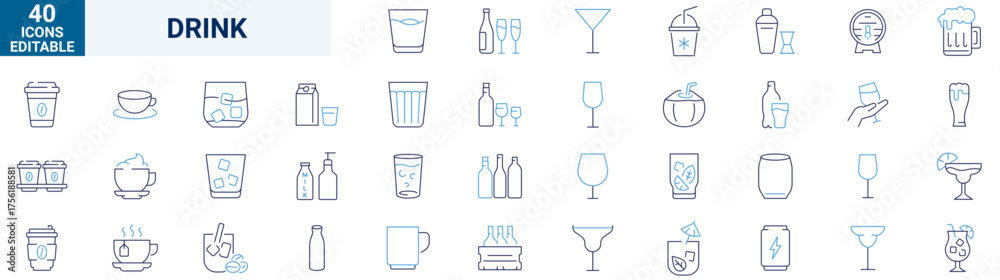Drinks web icons in line style. Coffee, tea, soda, beer, alcohol, coctail, energy, wine, collection. Vector illustration #1756188581