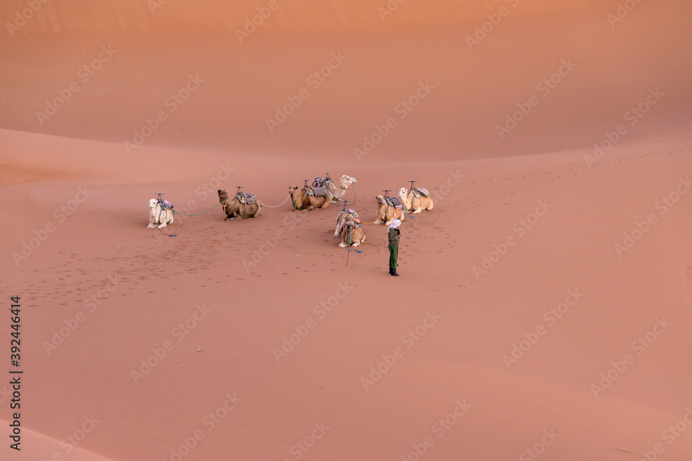 Dromedary group on the desert dune of Erg Chigaga, at the gates of the Sahara, at dawn. Morocco. Concept of travel and adventure. #392446414