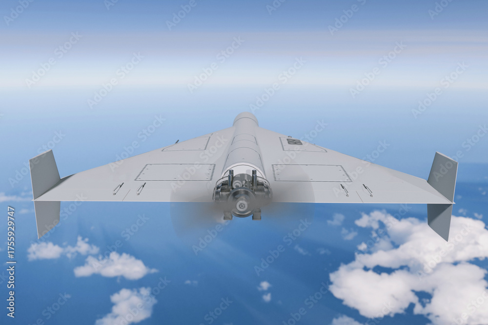Drone, concept. Combat military drone flies high above the clouds. The drone, carrying explosives, crossed the border. Drone warfare. #1755929747