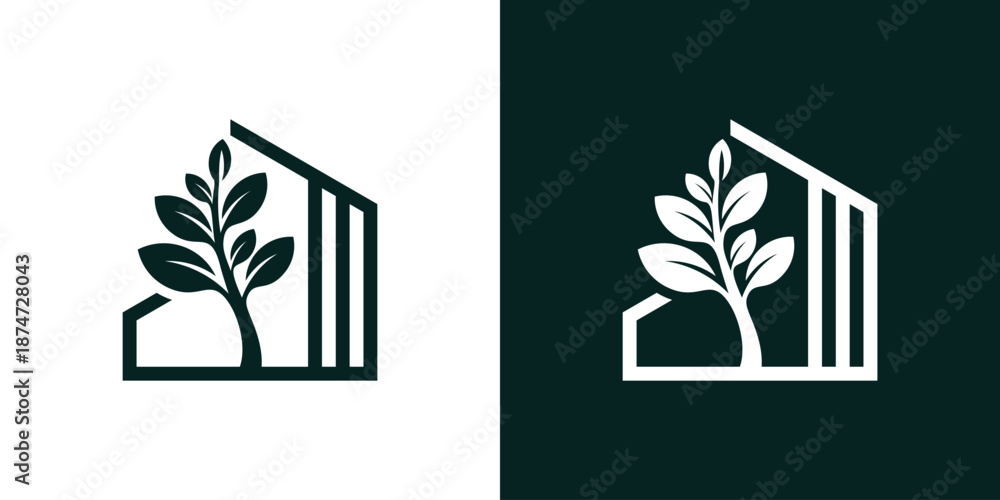 Dual meaning logo combining a house and plant elements, symbolizing greenhouse living, sustainability, eco-friendly homes, and natural growth. #1874728043
