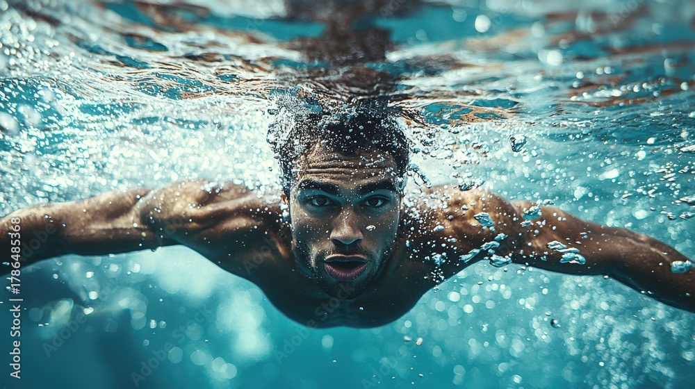 Dynamic waist-up portrait of a male swimmer gliding through water with intensity and focus in a pool setting #1786485368