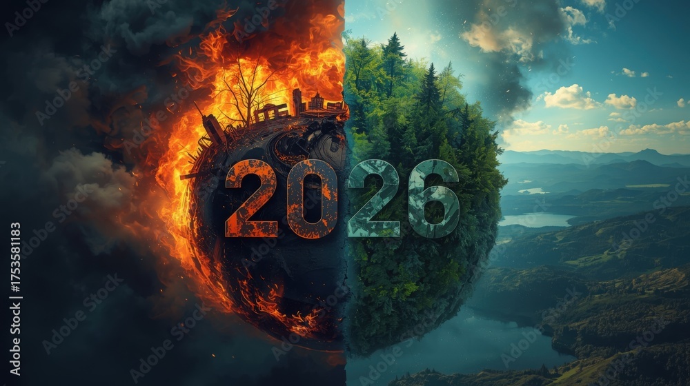 Earth divided showing climate change impact with the year 2026 prominently displayed #1753581183