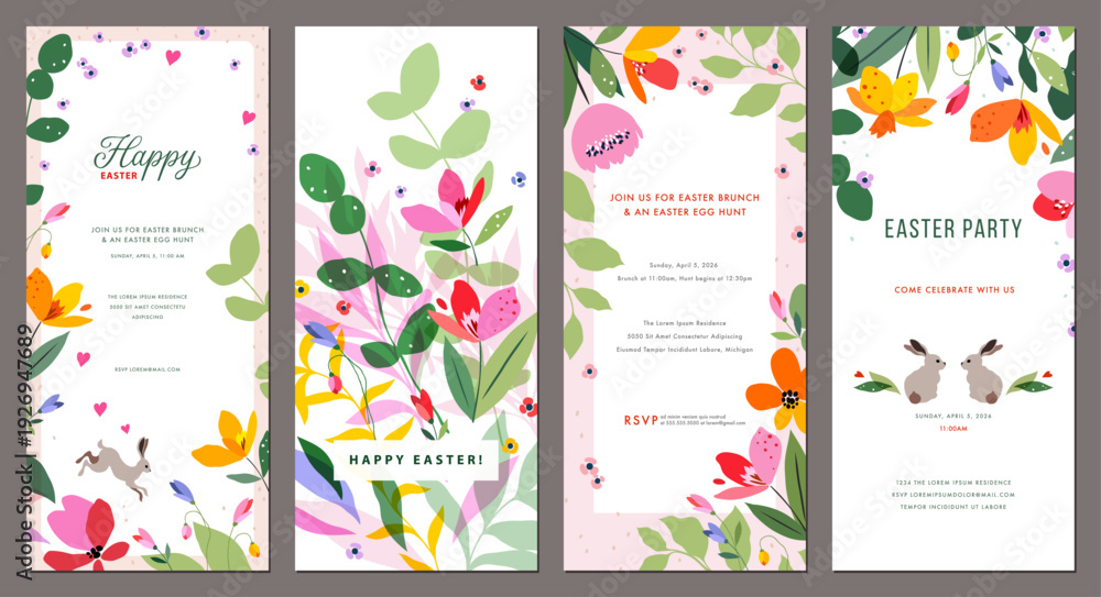 Easter templates 4x9. Floral greeting cards in spring vibrant colors with decorative flowers, Easter bunnies, floral frames and backgrounds with copy spase. For Birthday, Wedding, Baby invitations. #1926947689