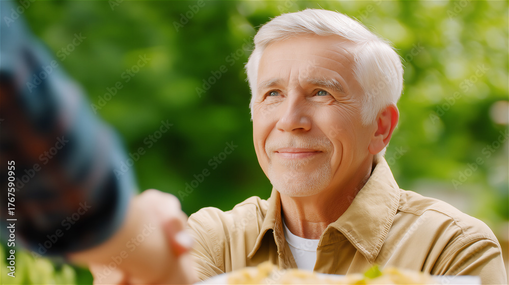 Elderly man smiling outdoors with supportive hand on his shoulder, symbolizing care, connection, and family bond. #1767590955