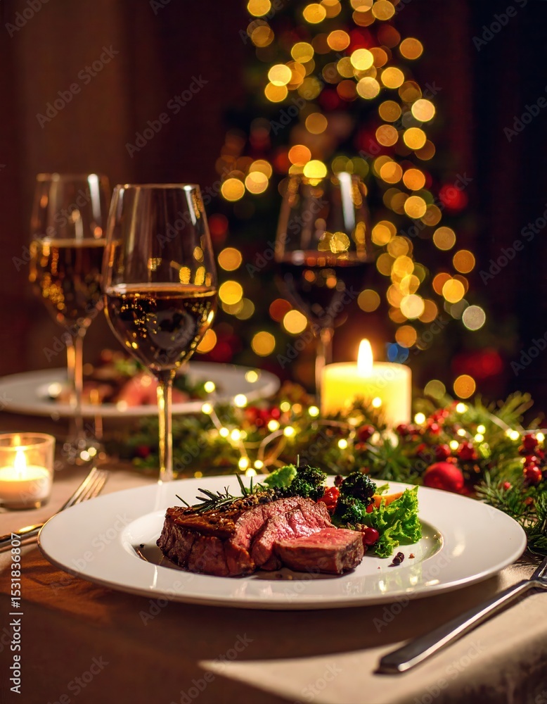 Elegant dinner setting with a festive Christmas table with wine and dessert #1531836807