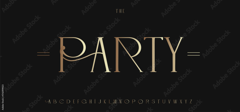 Elegant Gentle Font, Gold Luxurious Alphabet, Geometric Serif Letters, Heritage Type, Royal Shiny Golden Script, Premium Typography for Wedding Card, Restaurant Menu Title, Brand Logo. Vector Typeset #1763919023