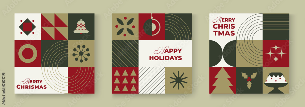 Elegant minimalist Christmas card set with geometric shapes and retro color palette. Perfect for holiday greetings, invitations, posters, and festive branding designs. Vector illustration #1761747191