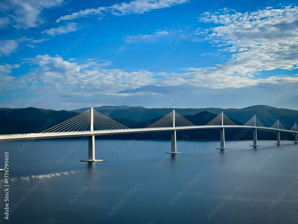 Elegant Peljesac Bridge rising over calm blue Adriatic waters with mountainous terrain in the background. Modern design and clear light highlight architectural and natural beauty in southern Croatia. #1776790601