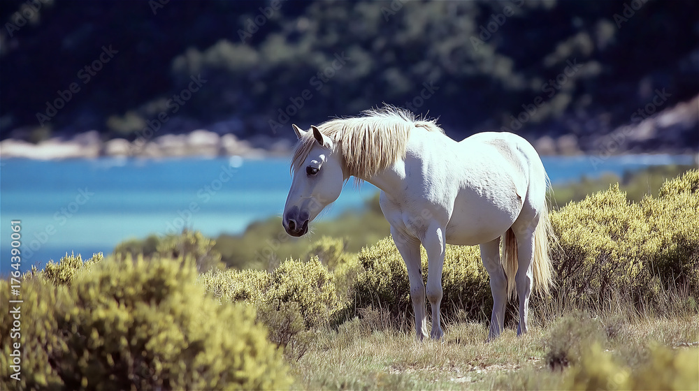 Elegant white horse standing on a hillside near water at golden hour. Concept of natural grace, freedom, and timeless beauty with wild landscape elements. #1764390061