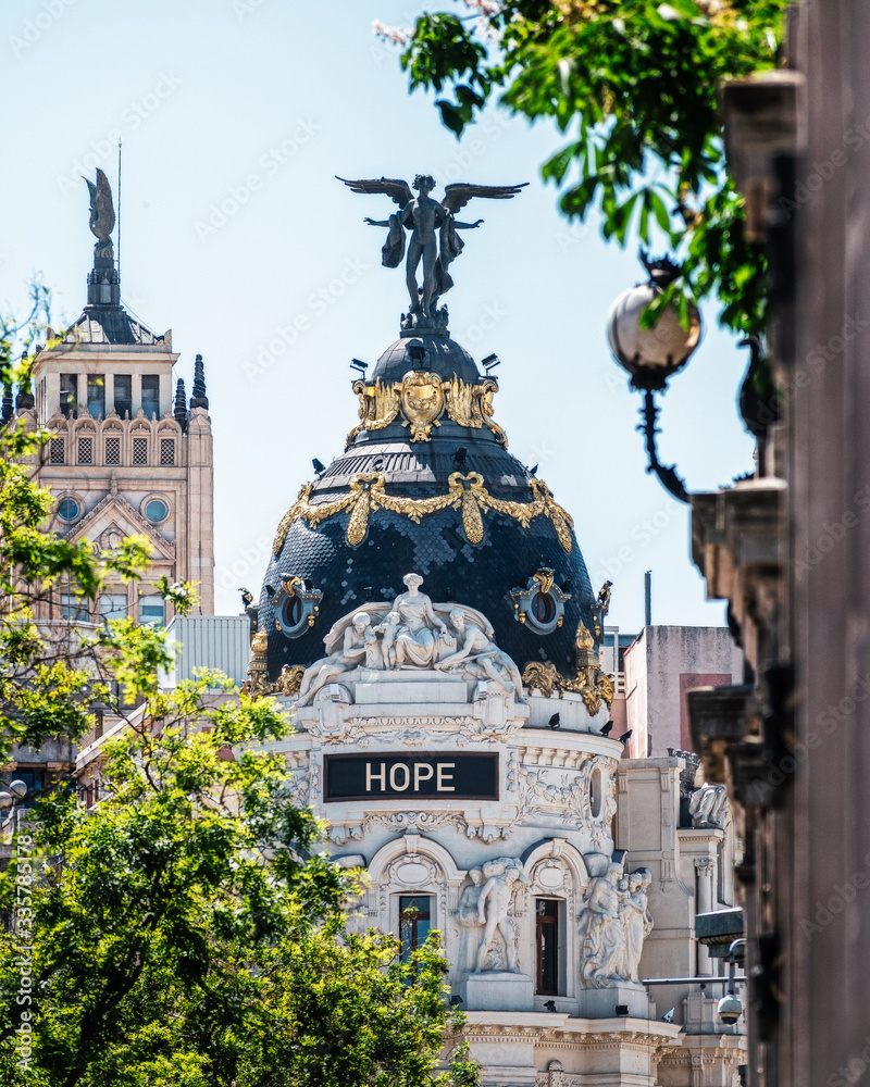 Emblematic buildings in Madrid, with the word "HOPE" message of optimism, due to the crisis of the COVID-19. Spain. #335785178