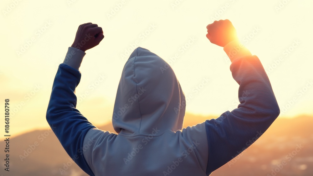 Embracing Success: A silhouette of a person standing triumphantly, their arms raised to the sky, symbolizing triumph and the pursuit of goals. #1868180798