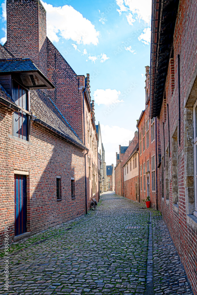 Empty cobblestone streets with red brick buildings from the Great Beguine of Leuven, Belgium, on a sunny day. Travel concept. #335786195
