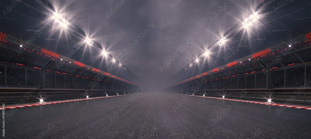 Empty racing track and glowing floodlights illuminated sport stadium at night. Professional 3D illustration for racing sports advertising. #1518073642