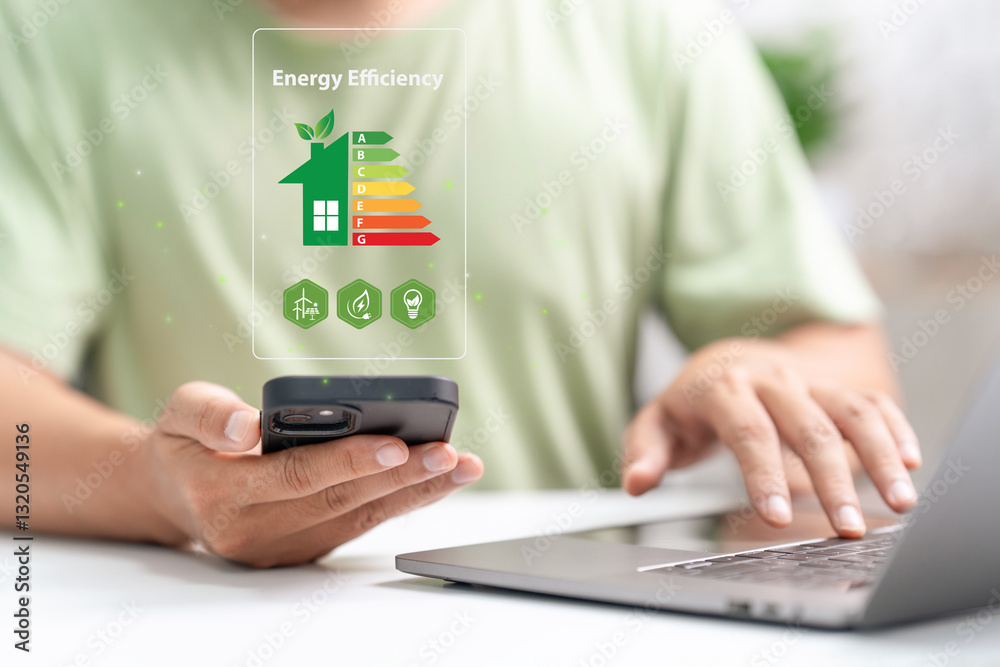 Energy efficiency rating and eco home renovation insulation performance concept. Energy efficiency mobile app on screen. Ecology, eco house and bioenergetic house, efficiency scale. #1320549136