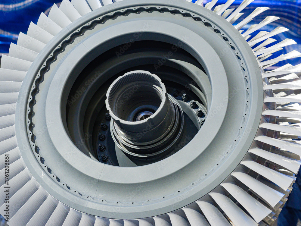 Engineering demonstrates aircraft turbine engine detail with metal blades, precision mechanics and aviation technology for aerospace industry. #1761203851