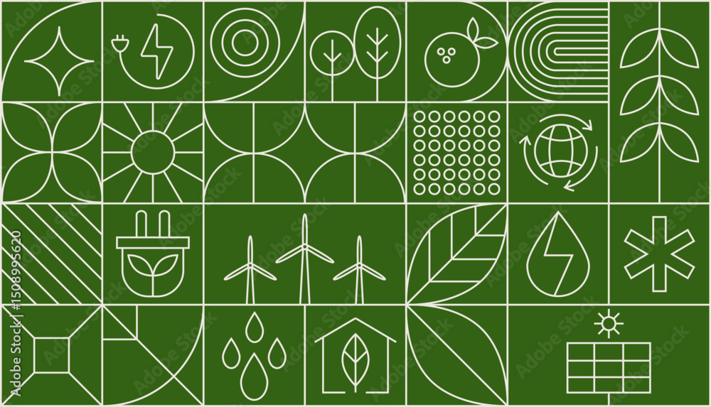 • #1508995588 Agriculture abstract modern line geometric pattern. Vector eco farming and green energy background with linear plants, sprouts and leaves, water waves, flowers, light bulb and sun, windmill.