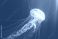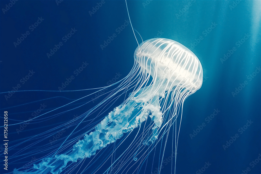 Ethereal jellyfish floating in deep blue ocean waters, showcasing the delicate, translucent beauty of marine life with an almost otherworldly, luminescent quality. #1756212058