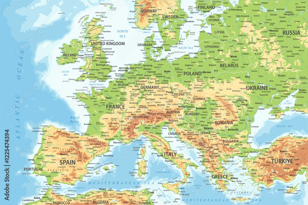 Europe Map Topographic Relief Colored - stock vector illustration #1225474394