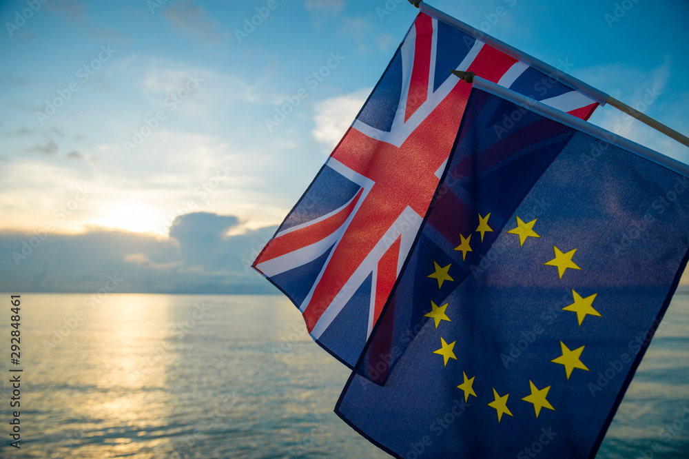 European Union and British Union Jack flags flying together as the sun rises on a new era on the relationship between the EU and the UK after Brexit #292848461