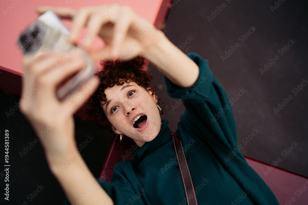 Excited red-haired girl making surprised face while snapping selfie outdoors. Whimsical expression adds charm and authenticity to casual street photography moment. #1944581389