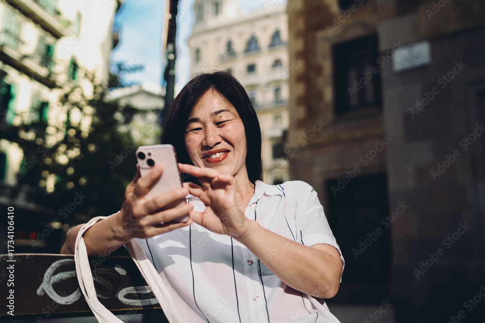 Excited woman using smartphone with bright emotion, symbolizing dynamic mobile communication and the immediacy of social digital connectivity in real-time life. #1734106410