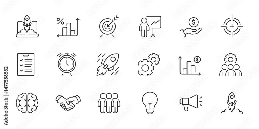 Explore a versatile collection of effective line icons ideal for startup themes and business launches. Perfect for enhancing presentations and web design for a polished, professional appearance #1477558532