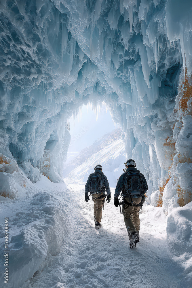 Explorers journey through ice cave with stunning icicles and snowy landscape in winter, vertical view, exploration and antarctic speleology concept #1768738492