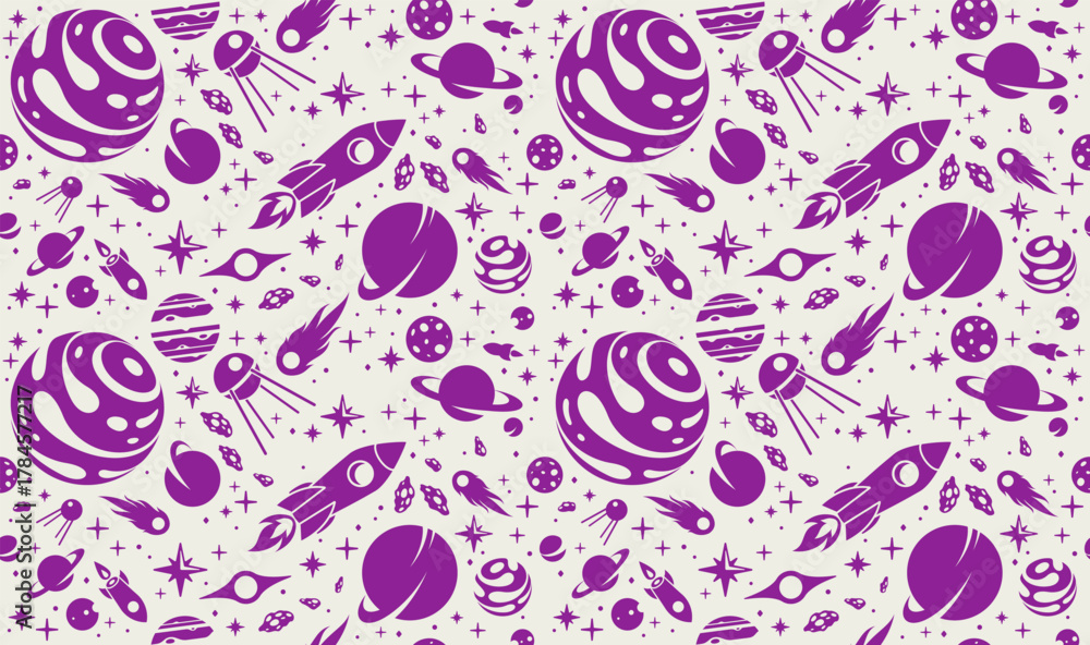 Exploring space seamless background, vector cartoon rockets flying among planets and stars endless wallpaper, astronomy school education for children tiling pattern. #1784577217
