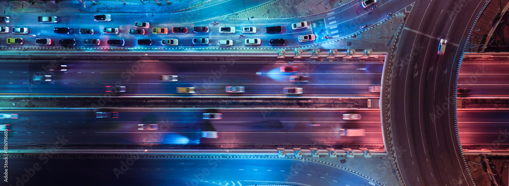 Expressway, Self-driving autonomous electric cars of the future with elements move along a busy traffic intersection. Artificial Intelligence, Car Scan, GPS Tracking, Smart Roads, IoT, highway #1816916685