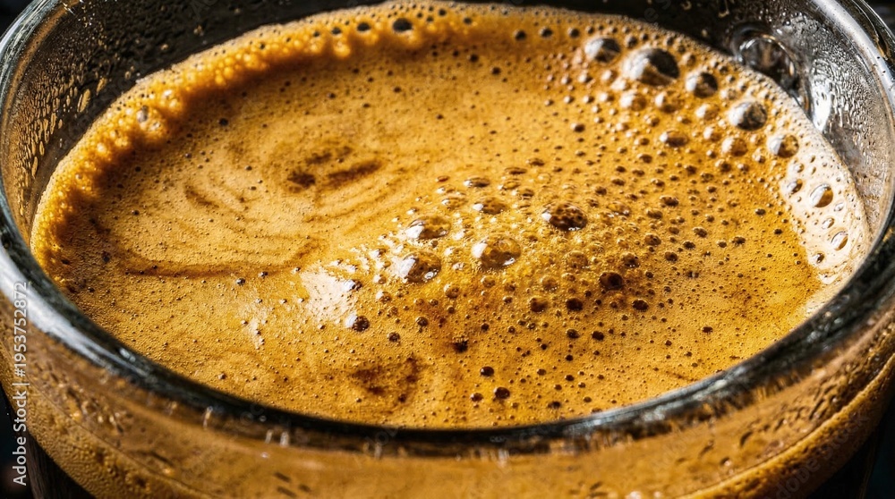 Extreme macro shot of a freshly pulled shot of espresso in a small glass cup, highlighting the rich golden crema forming bubbles on top. #1953752872