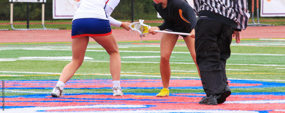 Faceoff in Intense Girls Lacrosse Game on Colorful Field #1770760817