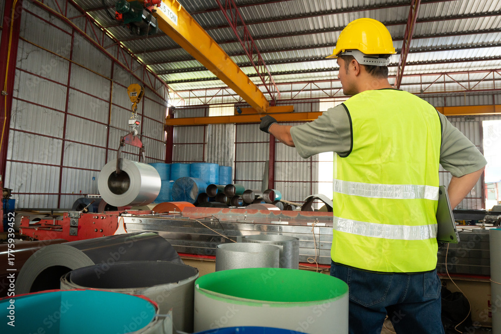 Factory workers take care of the management by diligently using steel coil lifters. It brings together precision and safety in the industry. #1775939452