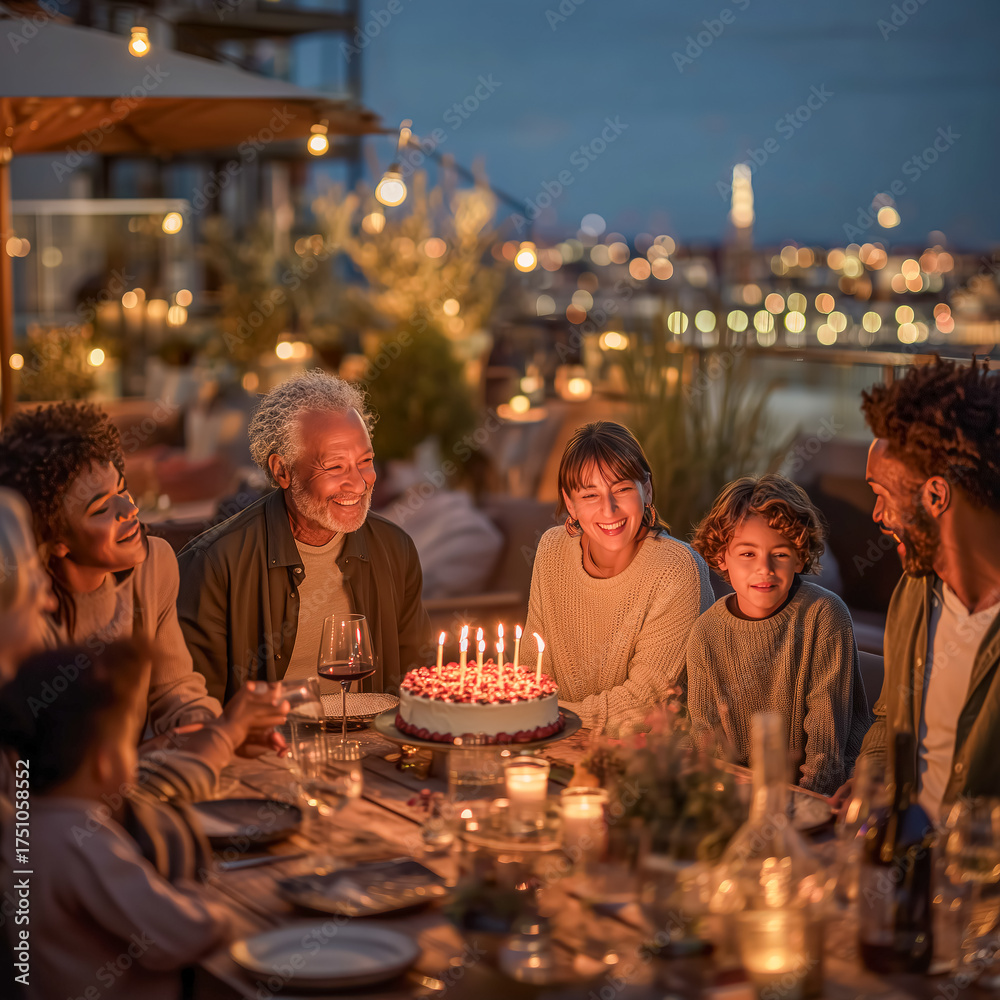 Family celebrates a joyful birthday dinner by candlelight with a city view in the background #1751058552