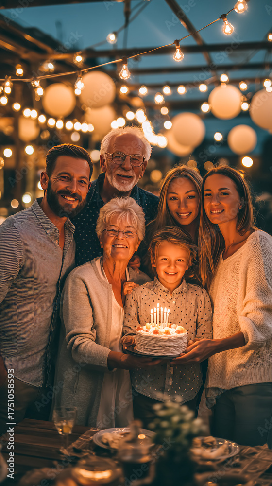 Family gathers around a birthday cake at a festive outdoor celebration in the evening #1751058593