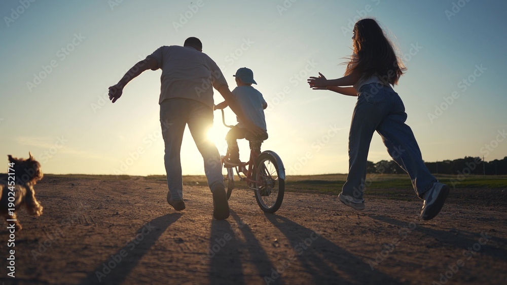 Family on dirt road at sunset. Family teaches their son how to ride bike. A father and child are riding a bicycle. A family on a gravel road during lifestyle sunset. #1902452174