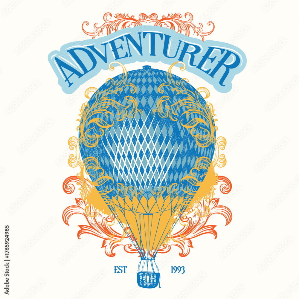 Fashion apparel vector print with hot air balloon in vintage style and hand drawn swirls, retro adventure #1765924985