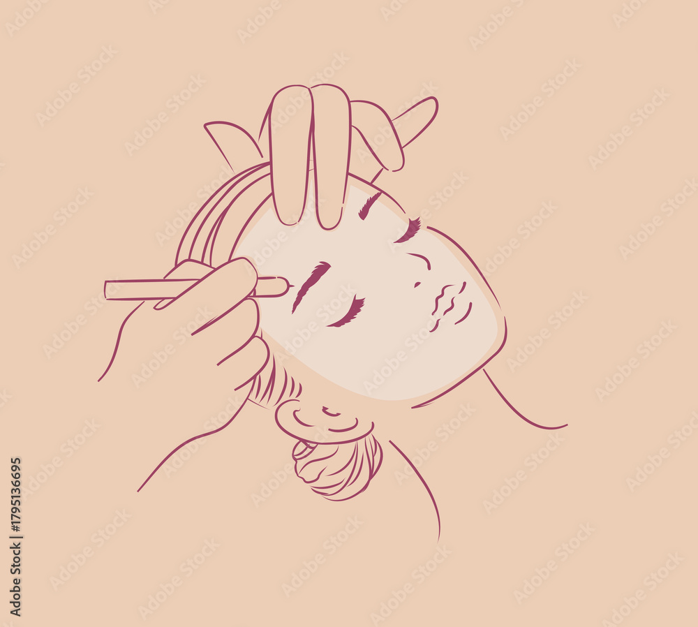 Female face eyebrow beauty procedure drawing in minimalist style on peach background #1795136695