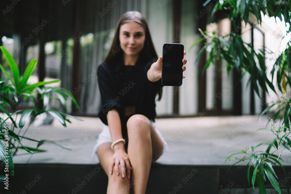 Female freelancer smiling with smartphone in tropical home patio, engaging in casual tech moment, combining career independence and effortless mobile presence. #1754398055