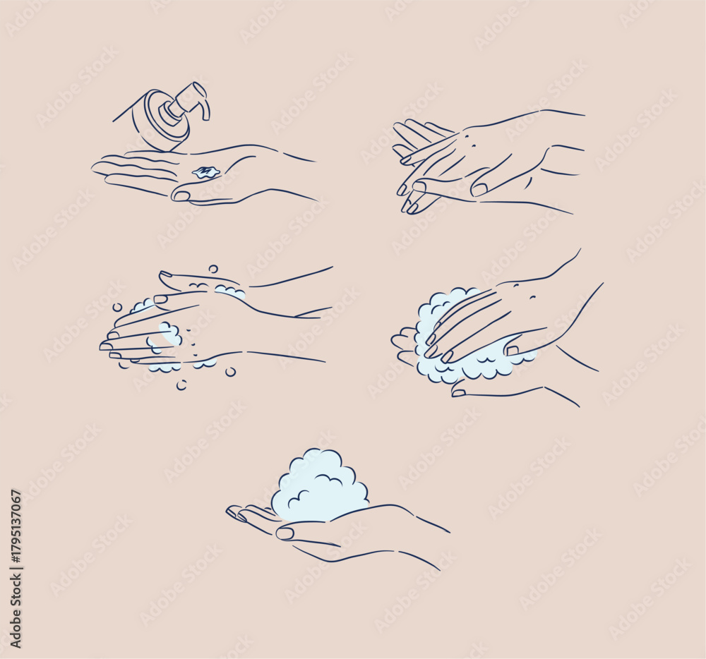 Female hand washing and treatment collection with soap, foam and cream drawing in minimalist style on beige background #1795137067