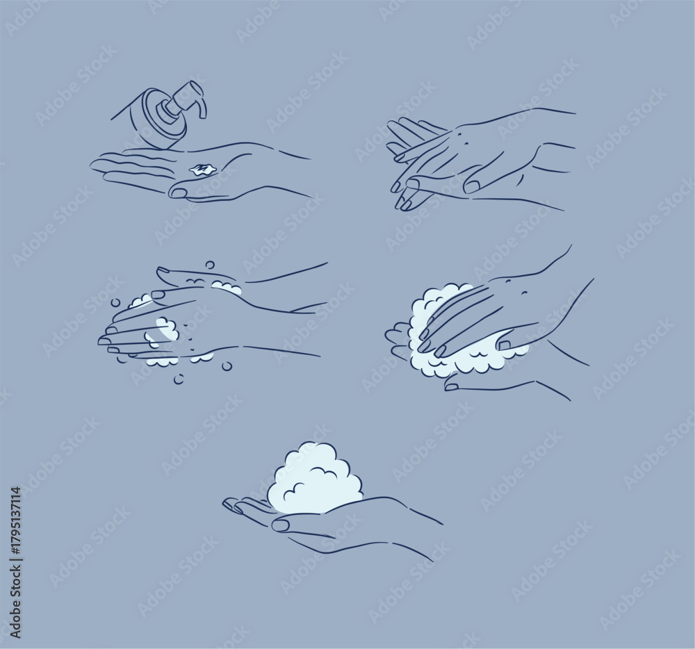 Female hand washing and treatment collection with soap, foam and cream drawing in minimalist style on blue background #1795137114