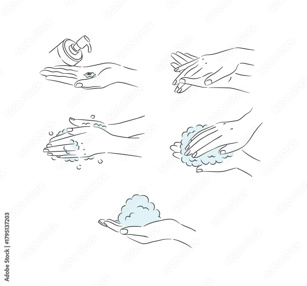 Female hand washing and treatment collection with soap, foam and cream drawing in minimalist style on white background #1795137203