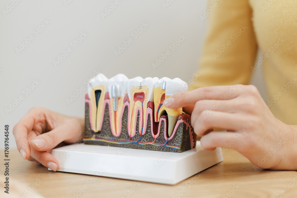 Female hands illustrating tooth anatomy with detailed dental model #1769764548