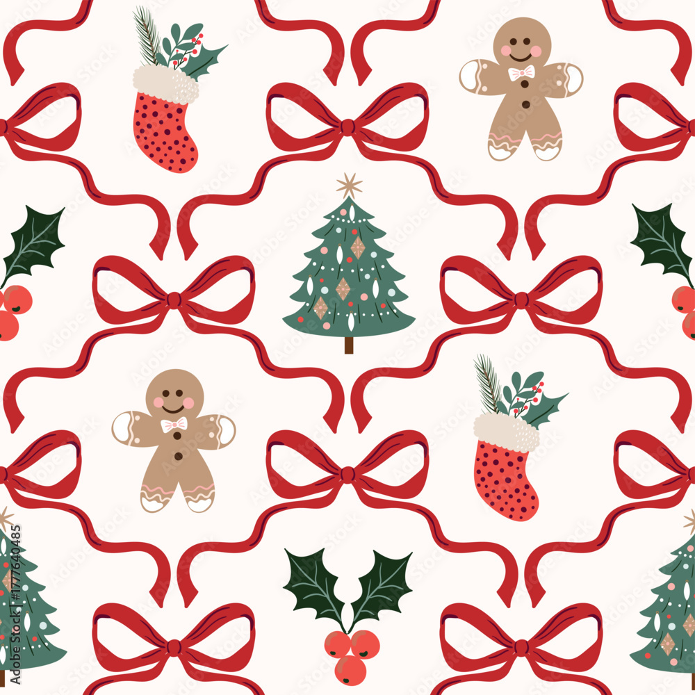 Festive seamless Christmas pattern featuring red bows, gingerbread cookies, holly leaves, Christmas stockings, and decorated trees. Perfect for wrapping paper, fabric prints, holiday stationery #1777640485
