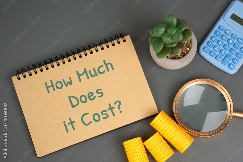 Finance and budgeting, learning and financial literacy concept. Represents expense planning in business. Notepad with the words How much does it cost written on it, a calculator, and coins #1748196982