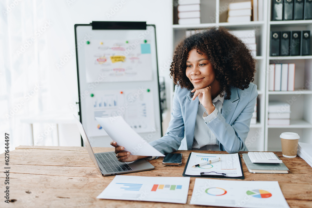 • #627645405 Beautiful young African american businesswoman using laptop computer and paperworks with planning working on financial document, tax, exchange, accounting and Financial advisor