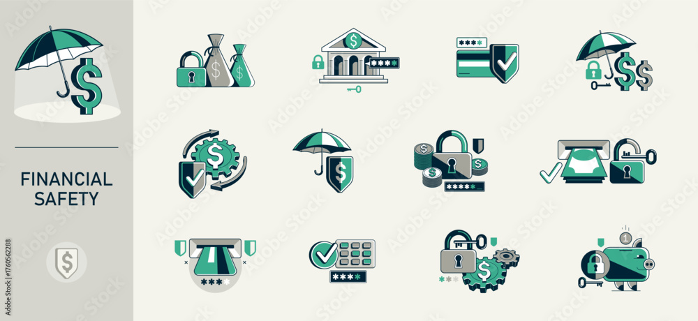 Financial safety vector detailed icons set, secured account and transaction, protected finance money. #1760562288