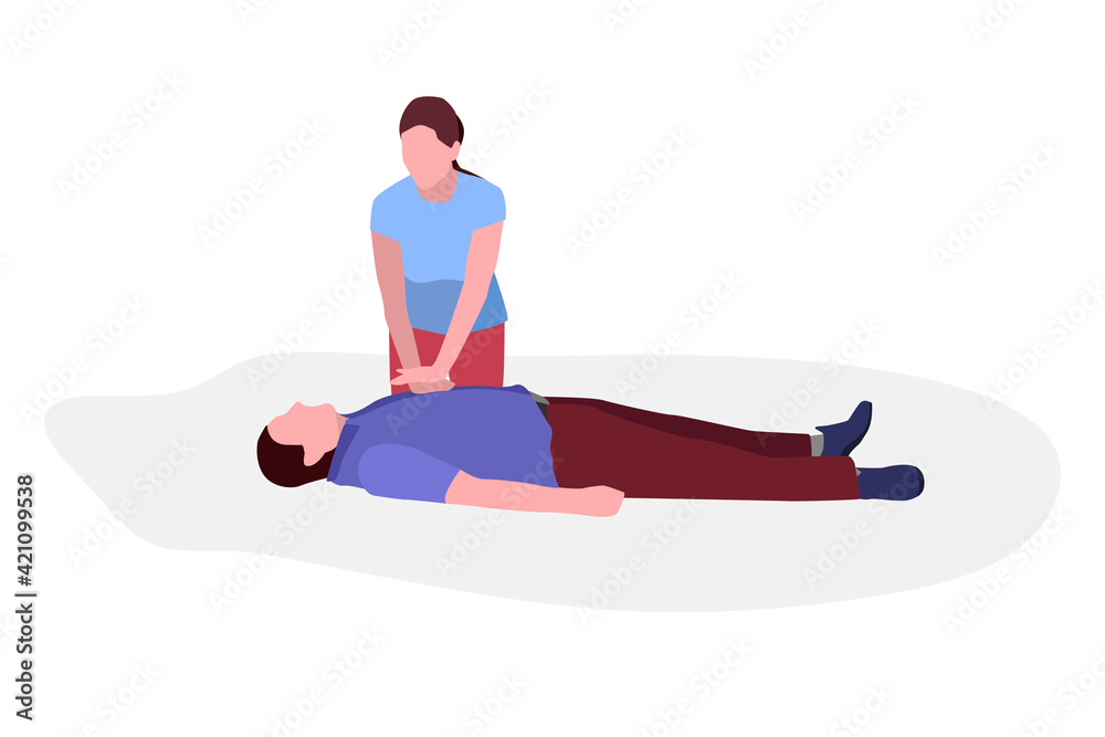 First aid. The girl makes a man who fell in the street cardiopulmonary resuscitation. Isolated illustration. Saving the life of an injured person #421099538