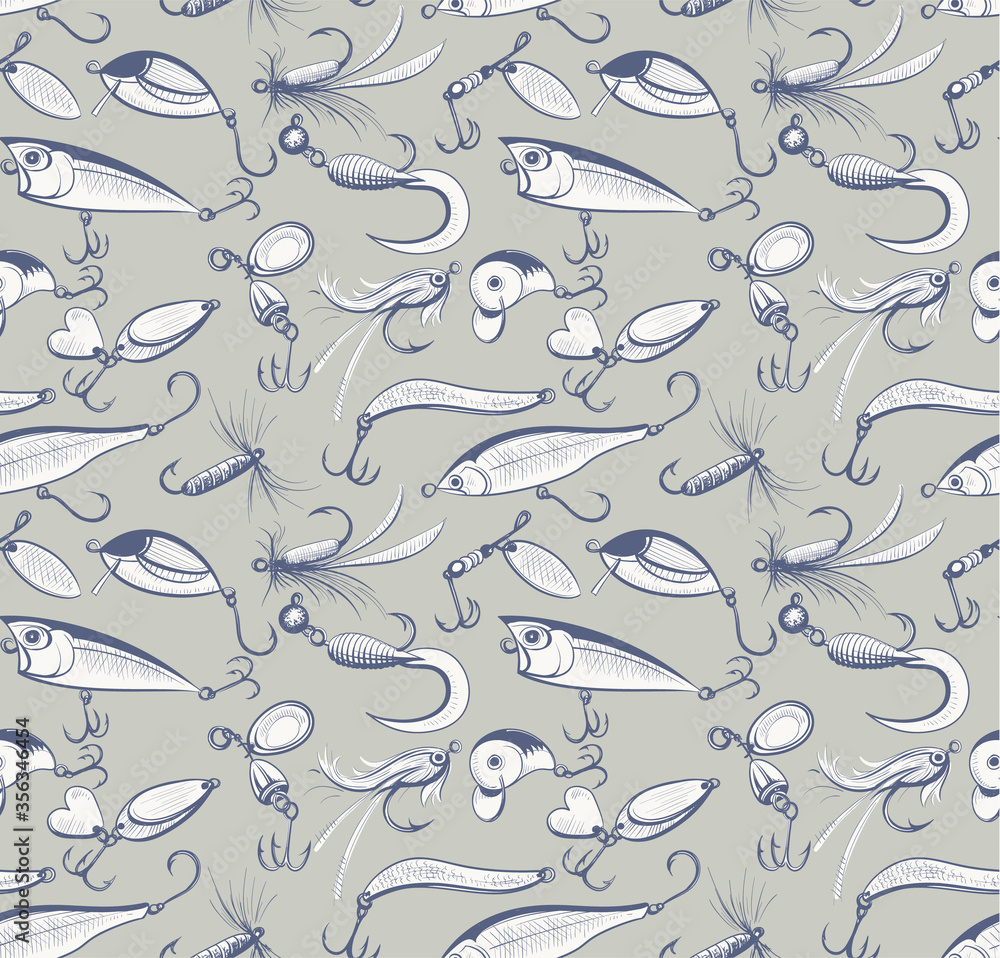 Fishing lures seamless pattern. Vintage sketch style vector illustration. #356346454